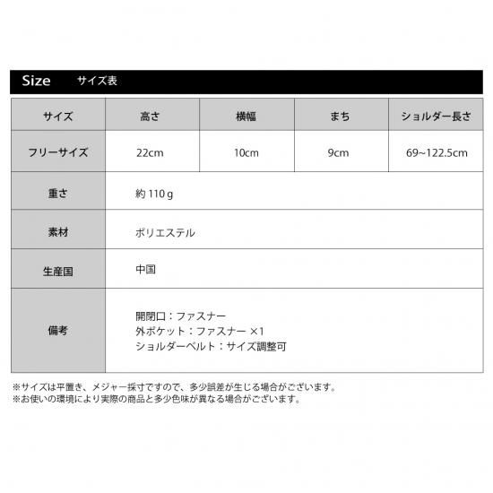 高さ:22cm/横幅:10cm/まち:9cm/ショルダー長さ:69~122.5cm